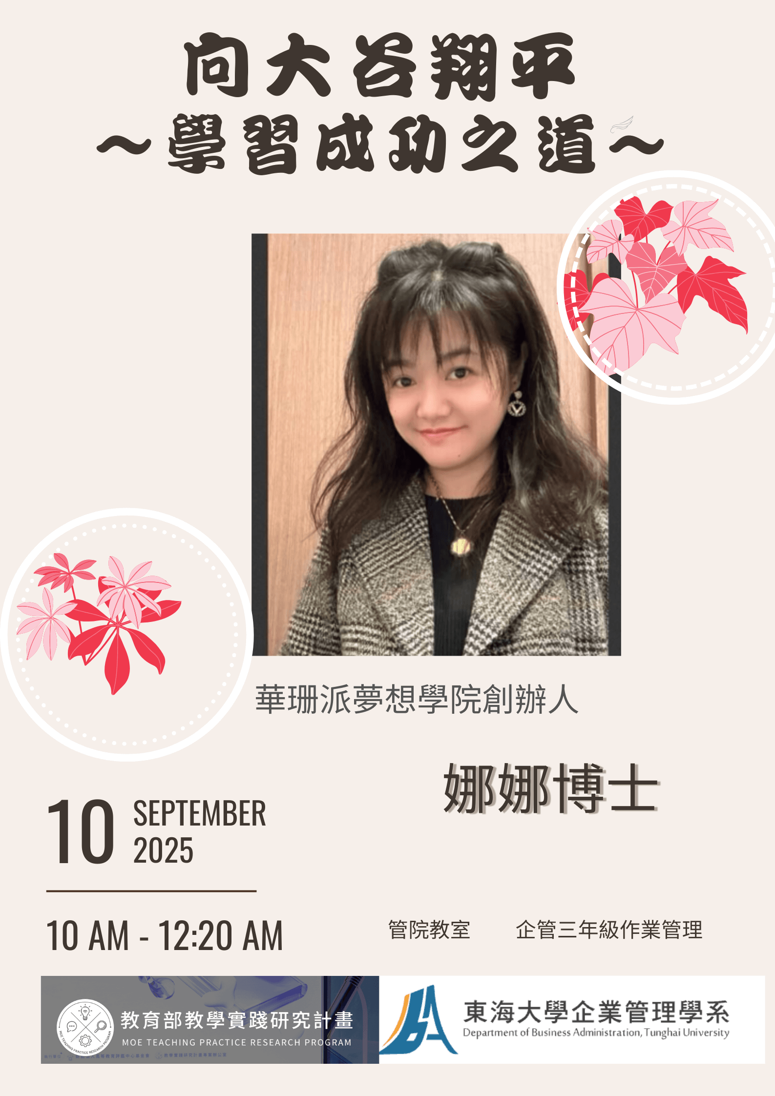 在快速變動的學習與職涯環境中,許多大學生面臨著「我夠好嗎?」「我未來要做什麼?」的焦慮與迷惘。✨為此,華珊派夢想學院創辦人——王珊彗博士(大家熟知的娜娜),於114年度正式執行教育部教學實踐研究計畫: